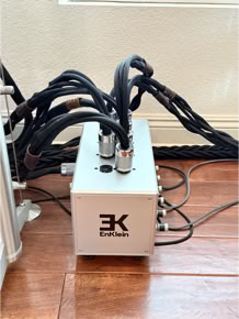 At the rear, a dedicated binding post incorporates a proprietary directional in‑line filter circuit that enables cascading with other EnKlein grounding devices, such as Ground Zero or SHT Power. This functionality is essential for protecting the Sovereign from ground loops caused by in‑room wiring or equipment faults. When ION grounding cables are connected to the ground binding posts, they provide a path of least resistance for equipment grounding. For ultimate performance and the lowest possible system noise floor, we recommend the XerXes directional ground.