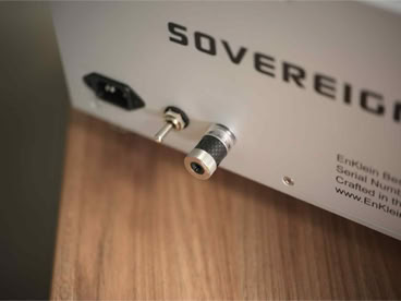 The unit features a distinctive binding post located at the rear, which integrates a proprietary directional in-line filter circuit designed for the cascading of EnKlein grounding devices, such as the Ground Zero or SHT Power. This capability is crucial for safeguarding the Sovereign against ground loops that may originate from the room wiring or faults in the equipment. Furthermore, the insertion of ION grounding cables into the ground binding posts provides a pathway of least resistance for equipment grounding. However, to achieve optimal performance and the lowest overall system noise floor, the use of the XerXes directional ground is recommended.